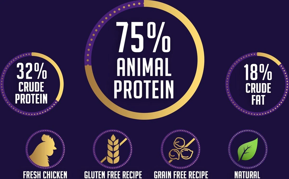 | Voedingswaarde | Verse kip (20%), gedroogde kip, erwten, gedroogde aardappel, gevogeltevet, gedroogde bietenpulp, zalmolie, gedroogde johannesbrood, eipoeder, biergist, lijnzaad, inuline (bron van FOS), mineralen, gedroogde wortel, brandnetel, Echinacea, gedroogde tomaat, gedroogde appel, gedroogde mango, gedroogde pruimen, gedroogde banaan, tijm, basilicum, spirulina, cranberry, selderij, glucosamine, chondroïtine. |