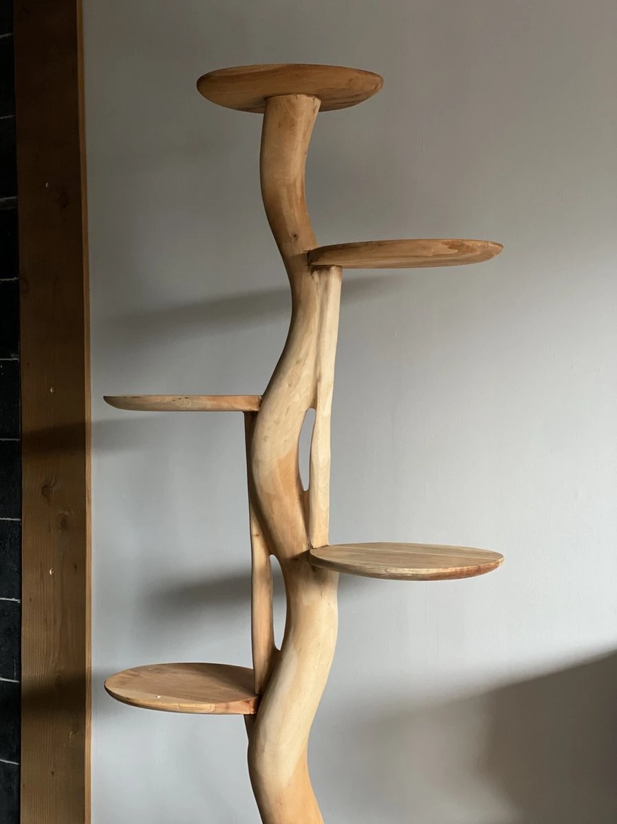 Robuuste boomsculptuur met plateaus gemaakt van suarhout en gemaakt uit één stuk boom. Dit is een hardhout soort welke gekenmerkt is door zijn verstrengelde nerf.