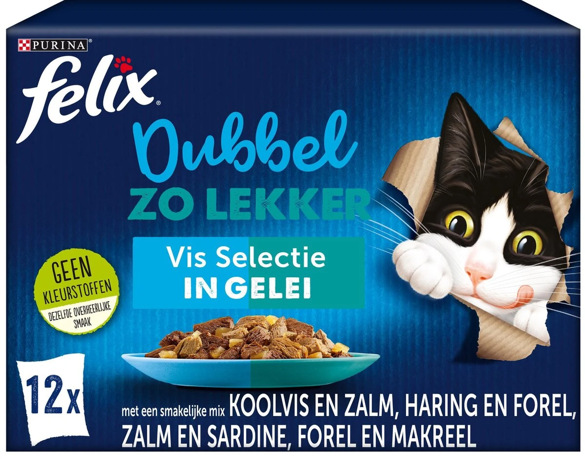 FELIX Dubbel Zo Lekker is een assortiment onweerstaanbare maaltijden die er zó lekker uitzien, zó lekker ruiken en zó lekker smaken alsof je het zelf hebt klaargemaakt. Elke maaltijd bevat malse reepjes van 2 verschillende smaken in een heerlijke gelei, zodat jouw kat kan genieten van 2 van zijn favoriete smaken in één maaltijd! Deze heerlijke maaltijden vormen ook een bron van omega 6-vetzuren met de juiste combinatie van vitaminen die jouw kat klaar zullen maken om nog meer kattenkwaad uit te halen. Ze zitten vol gezonde ingrediënten om 100% te voldoen aan de behoeften van jouw kat indien gevoed volgens de voedingsrichtlijnen op de verpakking.