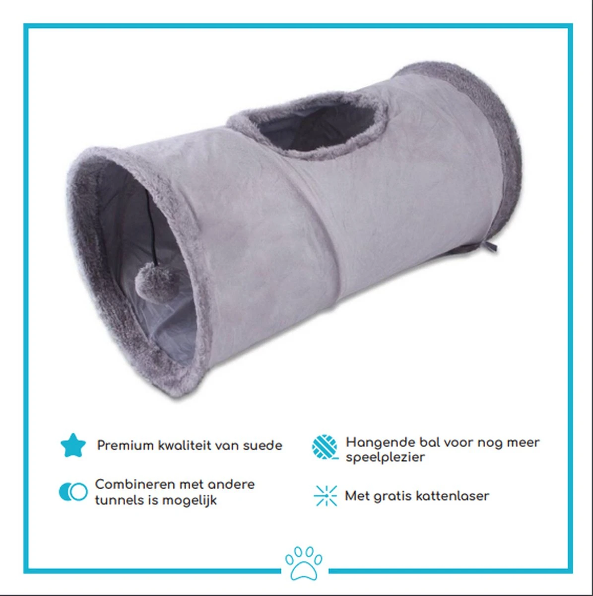 De tunnel is licht in gewicht en opvouwbaar. Dit is voordelig voor u aangezien de tunnel makkelijk opbergbaar is wanneer het niet gebruikt wordt.De tunnel heeft 3 gaten waar de kat in en uit kan. Als u een tunnel van dezelfde afmetingen haalt is deze aansluitbaar. Ook zit er een balletje aan de tunnel vast waarmee uw kat zich goed kan vermaken. Bovendien wordt het laserlampje gratis meegeleverd!
