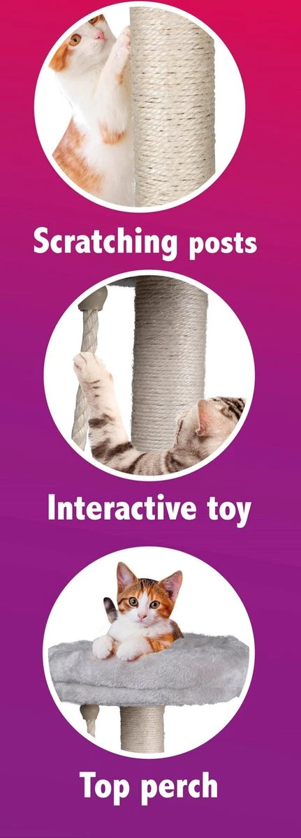 Op het onderste pluchen plateau staan 3 palen met samen 3 pluchen platforms waarop je kat heerlijk kan springen, zitten en liggen. 2 palen zijn omwikkeld met stevig sisal touw. Een geweldig materiaal om de nageltjes aan te scherpen. Je kat kan zich er helemaal tegen uitstrekken om lekker te krabbelen. Aan het hoogste plateau bungelt ook nog eens een stevig speeltouw waarmee je kat zich urenlang kan vermaken.