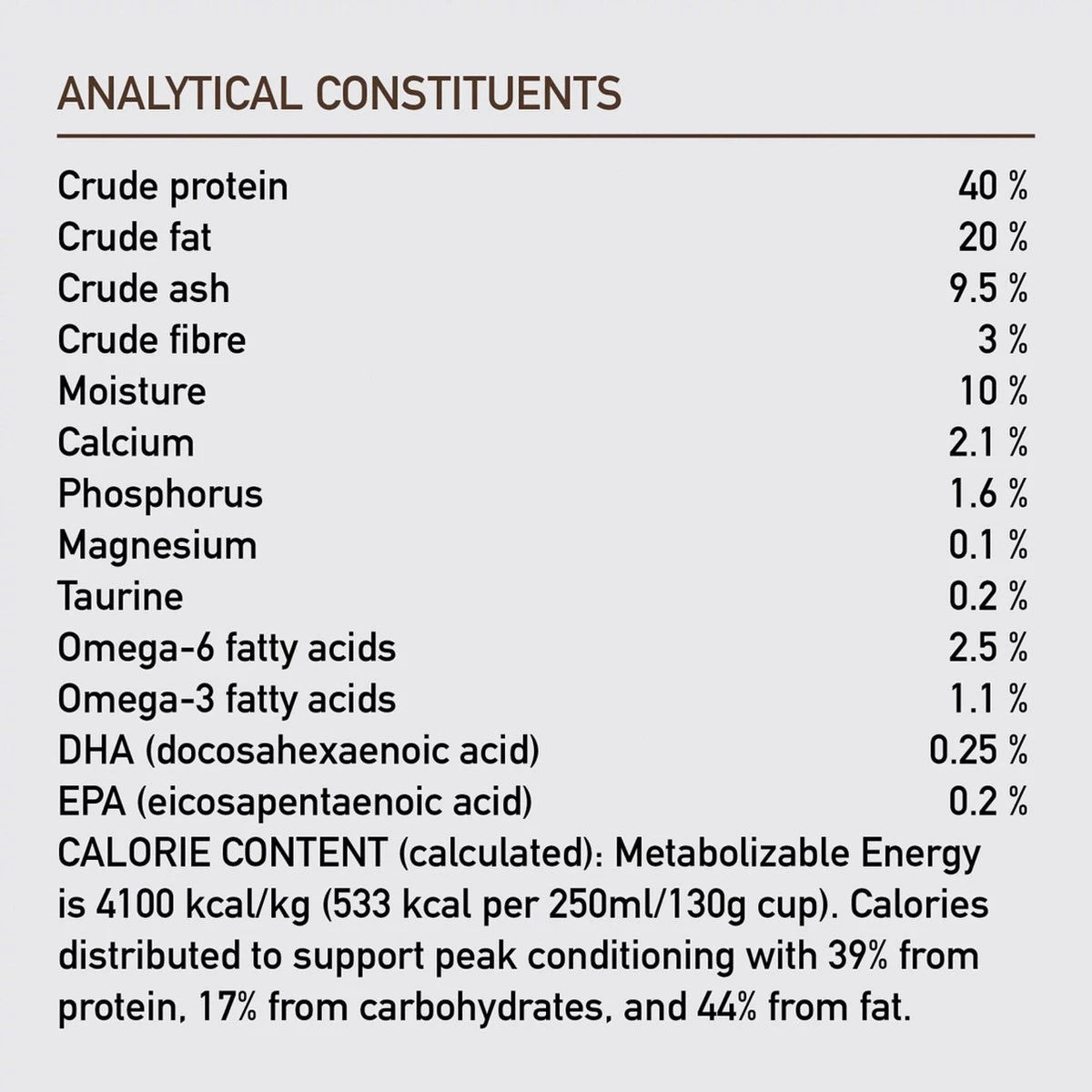 | Analytische bestandsdelen | Ruw eiwit 40 %<br />Ruw vet 20 %<br />Ruwe as 9,5 %<br />Ruwe celstof 3 %<br />Vocht 10 %<br />Calcium 2,1 %<br />Fosfor 1,6 %<br />Magnesium 0,1 %<br />Taurine 0,2 %<br />Omega-6 2,5 %<br />Omega-3 1,1 %<br />DHA / EPA 0,25 % / 0,2 % |