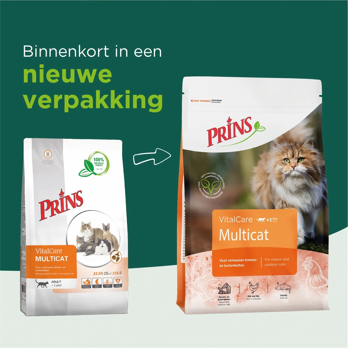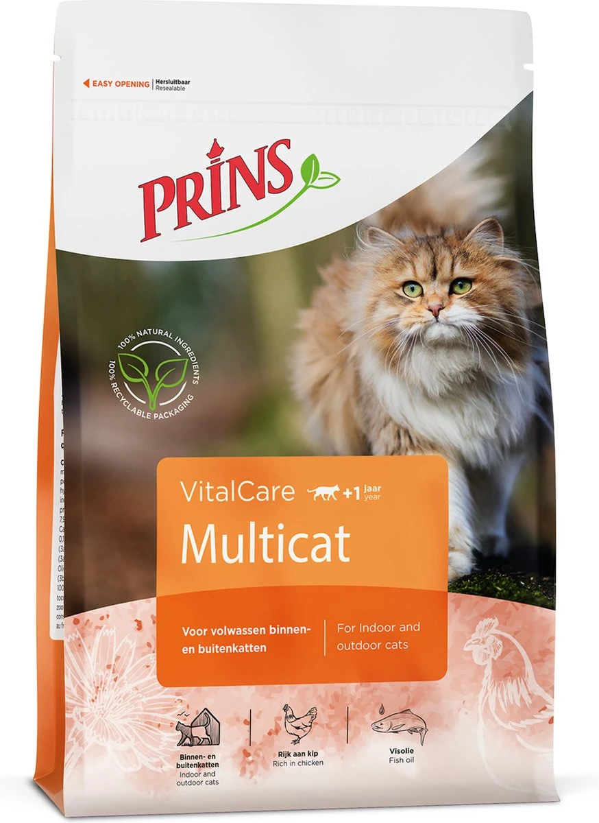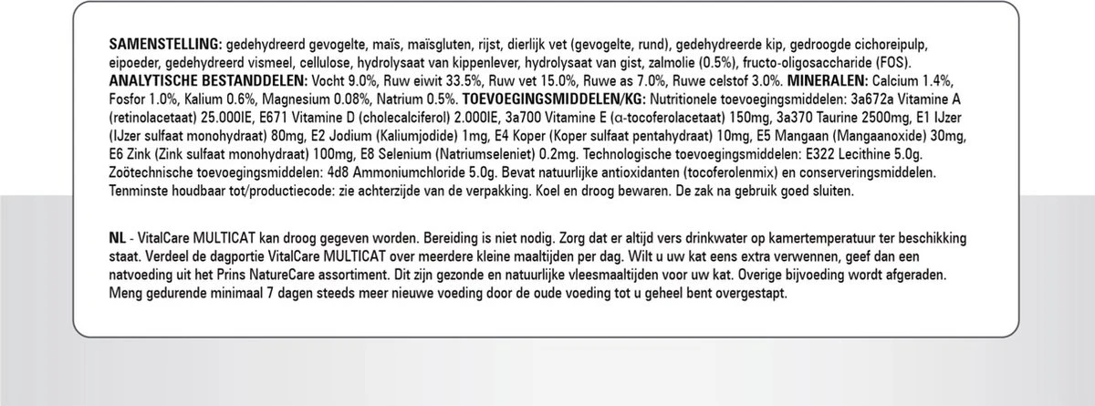 Prins VitalCare Multicat 4 kg. Bewust gezonde voeding voor volwassen gezinskatten. PrinsVitalCare Multicat is een hoogwaardige voeding speciaal samengesteld op basis van natuurlijke bouwstoffen die een gezonde werking van het lichaam van uw volwassen kat ondersteunt. Of het nu gaat om binnenkatten of buitenkatten, klein of groot, ze kunnen allemaal genieten van een complete voeding. De combinatie van drie smaken en speciaal gevormde brokjes geven een optimale smaaksensatie, zelfs voor de meest kieskeurige kat. Zalmolie bevat veel omegavetzuren zodat uw kat een gezonde en glanzende vacht krijgt en houdt. Vitaminen & mineralen in de voeding versterken de weerstand van uw kat. VitalCare Multicat is de ideale voeding voor een gezin met meerdere katten. Het bevat een mix van brokjes met de smaken vlees, kip en vis. Prins VitalCare Multicat is bijzonder geschikt voor volwassen katten tot een leeftijd van ca. 7 jaar. Daarna kunt u overstappen op VitalCare Senior. Dit product bevat urineverzurende stoffen voor een gezond milieu in de blaas. Let op, er zijn meerdere factoren die hierin meespelen, zoals bijvoorbeeld stress, inname vocht, ophouden urine, aantal kattenbakken in huis (stelregel: aantal katten plus 1). Samenstelling: Gedehydreerd gevogelte, maïs, maïsgluten, rijst, dierlijk vet (gevogelte, rund), gedehydreerd kip, bietenpulp, eipoeder, gedehydreerd vismeel, cellulose, hydrolysaat van kippenlever, hydrolysaat van gist, zalmolie (0.5%), Fructo-Oligo-Sacchariden (FOS). Analyse Vocht 9,0% Ruw eiwit 33.5% Ruw vet 15.0% Ruwe as 7.0% Ruwe celstof 3.0% Mineralen Calcium 1,4% Fosfor 1,0% Kalium 0,6% Magnesium 0,08% Natrium 0,5% Energiewaarde 3990 kcal/kg Lage activiteit Hoge activiteit Lichaamsgewicht (kg) Hoeveelheid (gram/dag) Hoeveelheid (gram/dag) 2 30 40 3 40 55 4 55 65 5 65 80 6 80 90