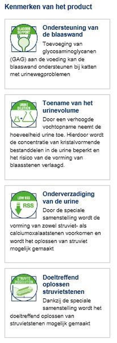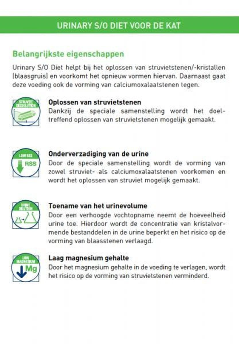 Urinary S/O kan worden ingezet voor het voorkomen en het oplossen van urinekristallen in de lagere urinewegen. Door de unieke samenstelling kunnen struvietstenen worden opgelost en kunnen zowel struviet- als calciumoxolaatstenen worden voorkomen. Het licht verhoogde natriumgehalte zorgt er daarbij voor dat de vochtopname wordt verhoogd. Hierdoor zal het urinevolume toenemen waardoor de concentratie aan kristalvormende deeltjes wordt beperkt. Deze voeding kan in combinatie met antibiotica ook worden gebruikt bij een blaasontsteking, overleg dit eerst met je dierenarts.