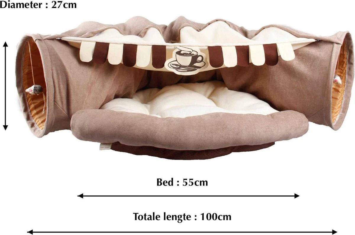 De kattentunnel is voorzien van een heerlijk slaapbedje. Wanneer je trouwe viervoeter genoeg heeft van spelen, kan hij/zij zich in alle comfort lang uitstrekken en genieten van een oase van rust.